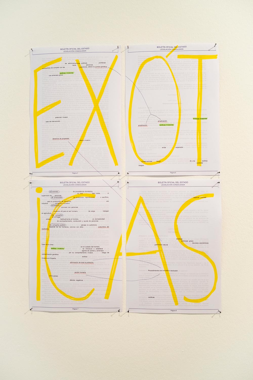 El concepto de plaga indica una relación entre vida y territorio: formas de vida que, a partir de ese momento, serán consideradas excesivas en un espacio determinado. Ser una plaga significa que estás categorizado como un agente que desestabiliza un sistema de relaciones estandarizado. La plaga es una noción matemática y una matriz económica: el número de individuos considerados problemáticos para una determinada operación económica en un territorio. En España hay alrededor de 50.000.000 de cerdos. Estos cerdos son animales criados con el fin de venderlos como proteína animal muerta. También hay 1.000.000 de jabalíes. Los primeros son parte de la economía de vida o muerte del capitalismo contemporáneo; los últimos se consideran una molestia porque obstaculizan la especulación inmobiliaria en las zonas forestales. Aunque ambos son de la misma especie —Sus scrofa—los cerdos son considerados reproductores y los jabalíes, una plaga. Vivir para ser producido y vivir para ser eliminado, respectivamente. Esta exposición vincula el concepto de plaga con la forma en que se clasifican los seres vivos. Eucalipto, loros, pastos urbanos, agua, especies nativas y especies invasoras; ofrecemos una mirada crítica a las formas actuales de gestión de la “naturaleza”.